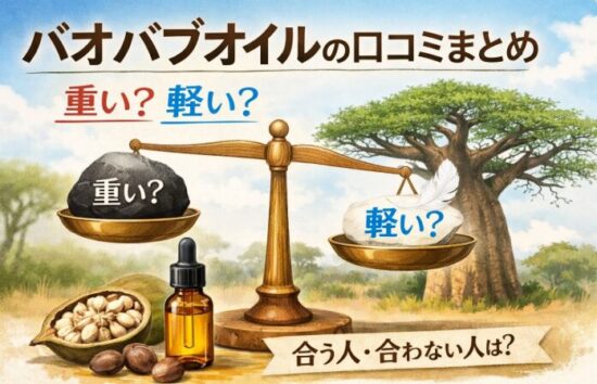 バオバブオイルは、口コミを見ると「軽いのにしっとり」「肌なじみが良い」と感じる人がいる一方、「重い」「テカる」と感じる人もいます。