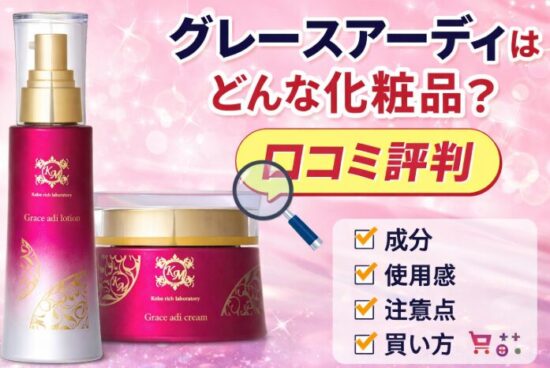 Grace adi(グレース アーディ)は、整肌成分としてアミノ酸誘導体「ナールスゲン」を配合し、さらにセラミド・ヒアルロン酸・プロテオグリカンなどの保湿成分も組み合わせたローション&クリーム。