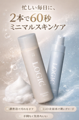 そんなとき、選択肢のひとつとして知っておくと助かるのが、泡洗顔+ミスト化粧水の2本で、60秒ケアを目指せるスキンケアブランド「LOGIC(ロジック)」です。