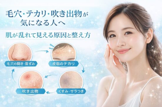 この記事では、毛穴・テカリ・吹き出物が気になる方に向けて、肌がなんとなく乱れて見えてしまう理由をやさしく整理しながら、毎日のスキンケアで見直したいポイントをわかりやすくお伝えしていきます。